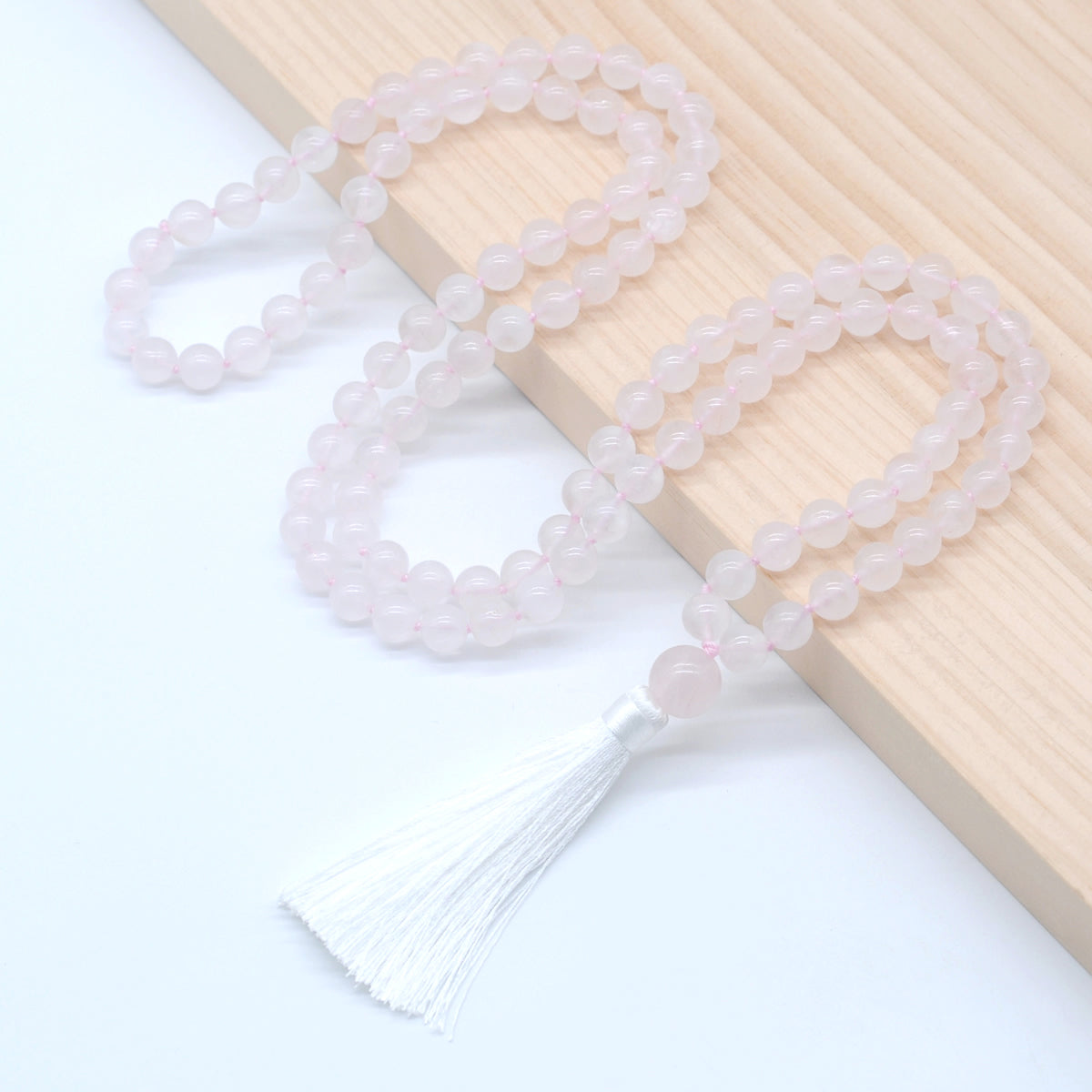 Style No.2: 8mm smooth rose quartz, 12mm smooth rose quartz guru bead & silk tassel (You can choose different tassel)
