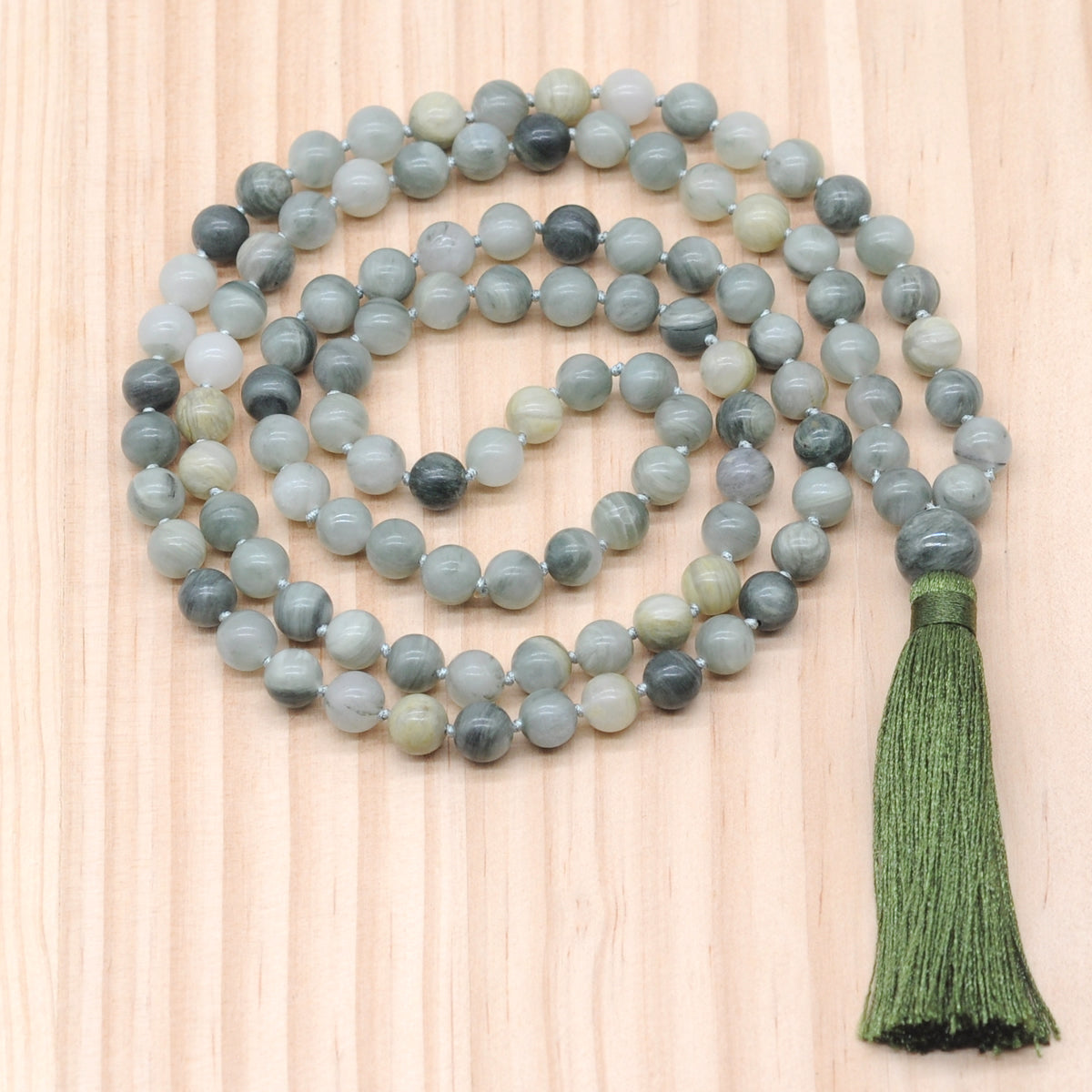 GMN187 Hand-Knotted Smooth Seaweed Quartz 108 Beads Mala Necklace