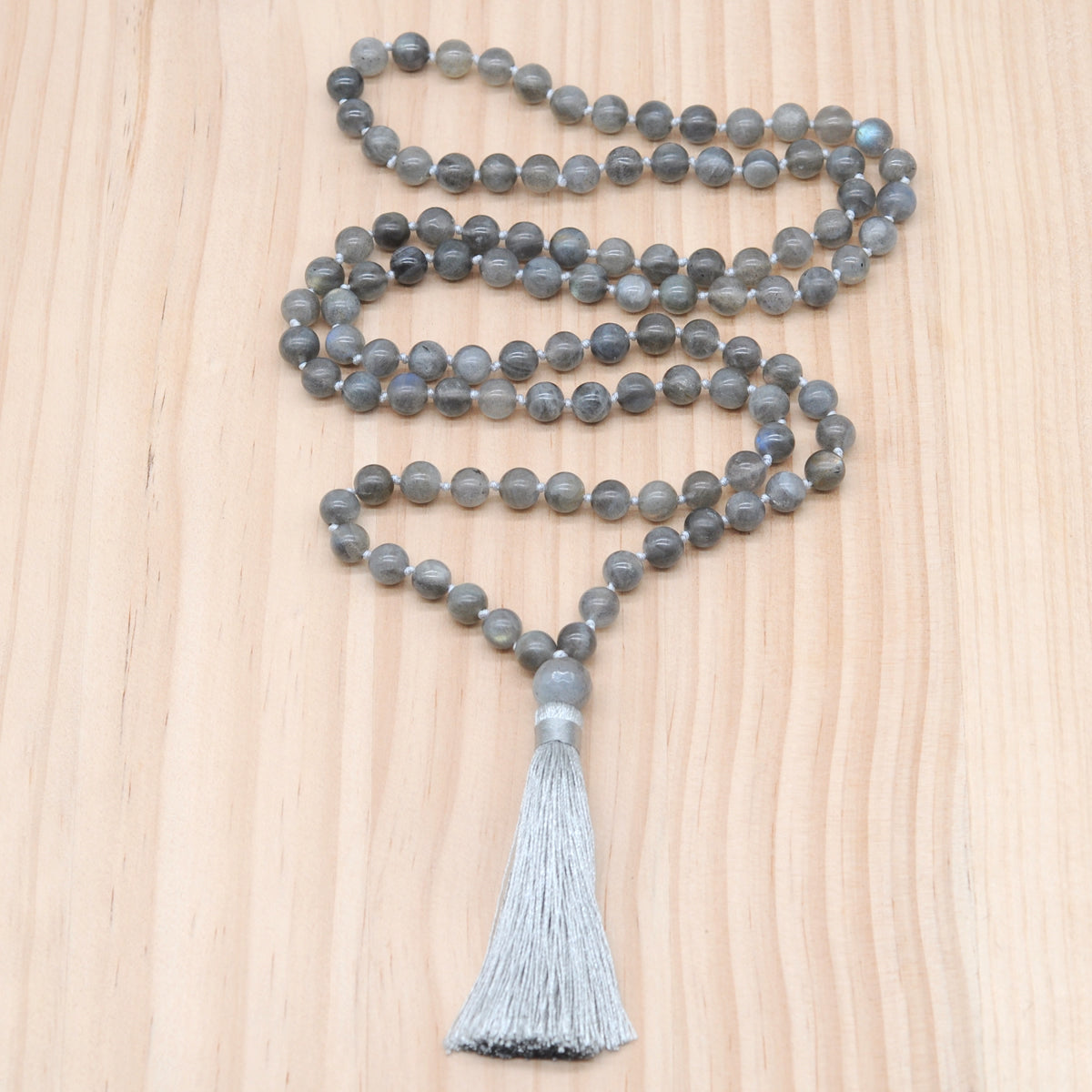 GMN197 Hand-Knotted Smooth Labradorite 108 Beads Mala Necklace